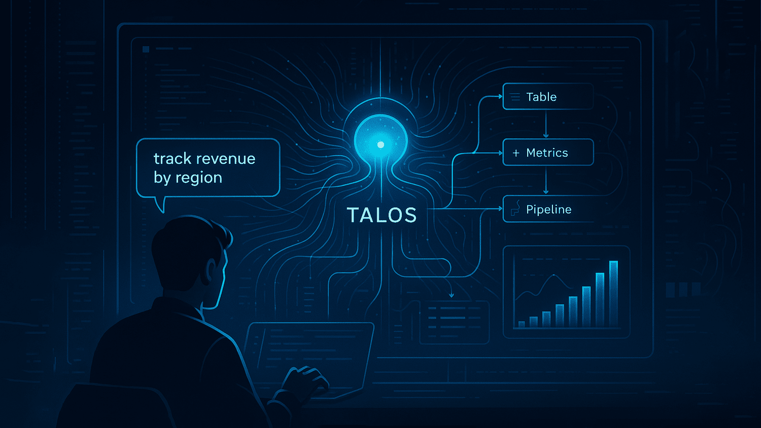 Talos understands high-level prompts like “build a customer lifetime value model” or “track revenue by product and region.” It then generates the necessary tables, metrics, joins, and pipeline logic required to support the request.
